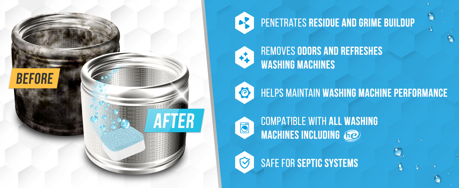 - Odor elimination — designed to freshen not only the drum but also rubber seals, gaskets, detergent compartments, etc.